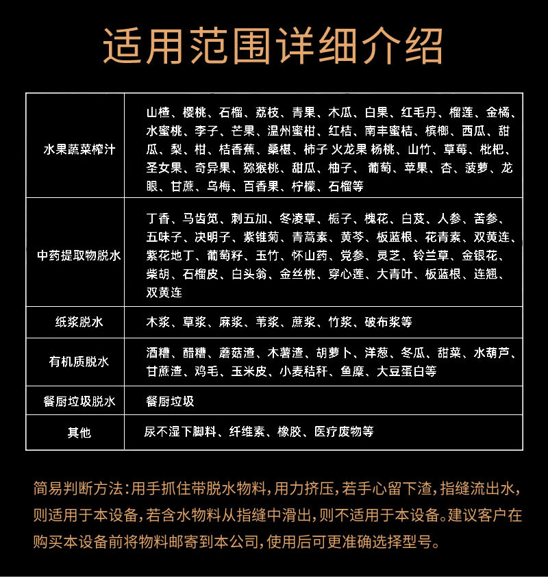 由于待脫水物料種類繁多,不同物料的含水率、分子水比例、粘度、纖維含量、吸水性、韌性、有機物或無機物等等數據各有不同,我公司工程師會根據每一位客戶提供的待脫水的物料進行分析,計算出適用于該物料的參數,制作出適合的設備,將物理壓榨作用利用到**,降低擠出物料含水率。