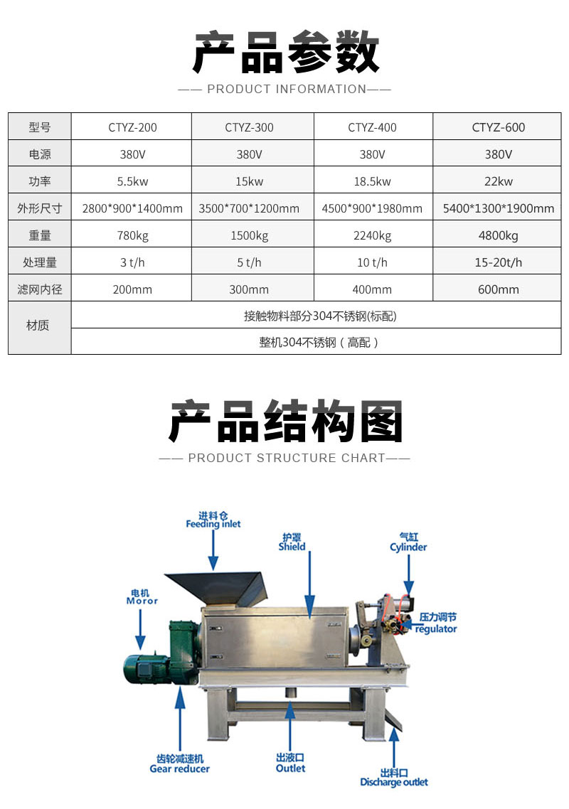 螺旋壓榨機關鍵部位噴涂耐磨層,螺旋絞龍葉片表面加焊一層合金刀頭,增加耐磨性;**部件采用304不銹鋼制作,耐酸耐堿耐腐蝕,從而大大延長設備使用壽命。