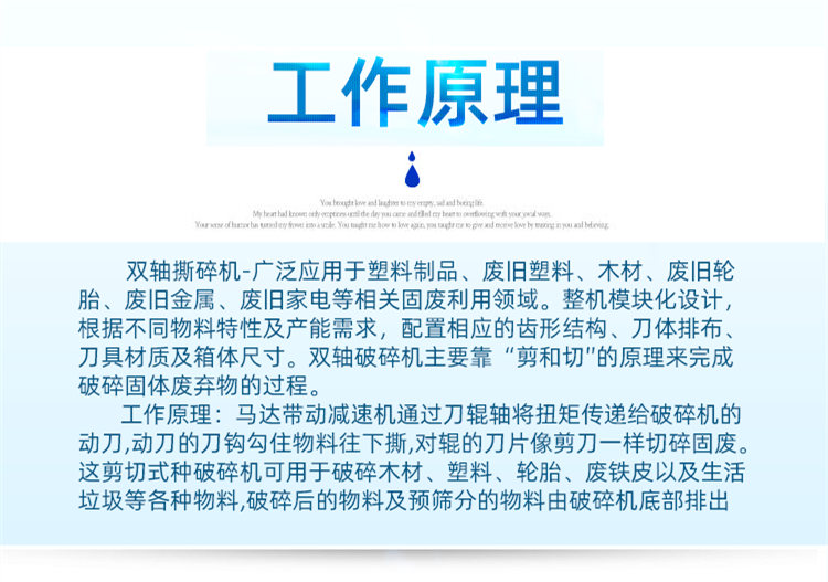 工作原理: 馬達帶動減速機通過刀輥軸將扭矩傳遞給破碎機的動刀,動刀的刀鉤勾住物料往下撕,對輥的刀片像剪刀-樣切碎固廢。這剪切式種破碎機可用于破碎木材、塑料、輪胎、廢鐵皮以及生活垃圾等各種物料破碎后的物料及預篩分的物料由破碎機底部排出。