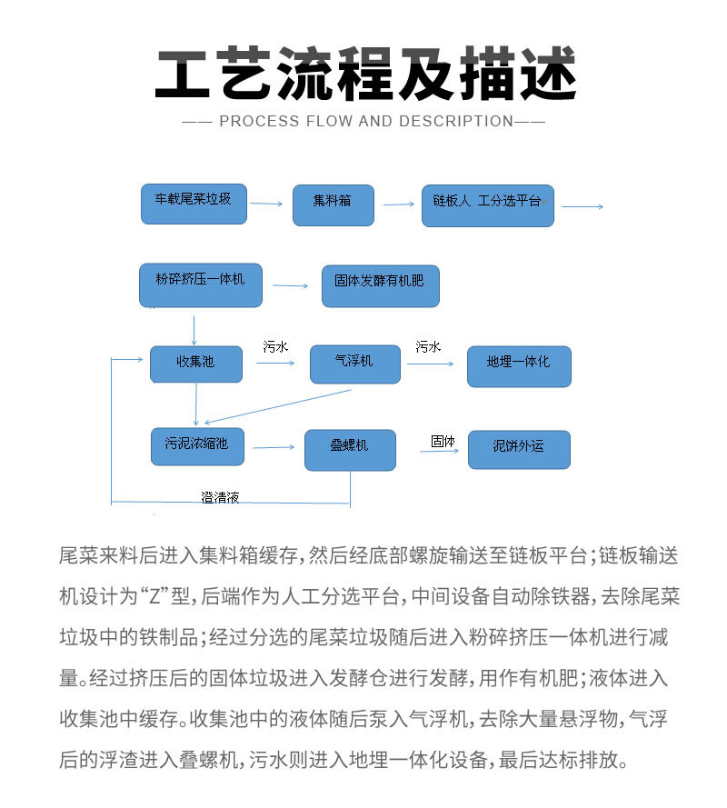 (1)尾菜垃圾利用運輸車傾倒在接料斗里,物料卸下后自動輸送至分揀鏈板平臺;