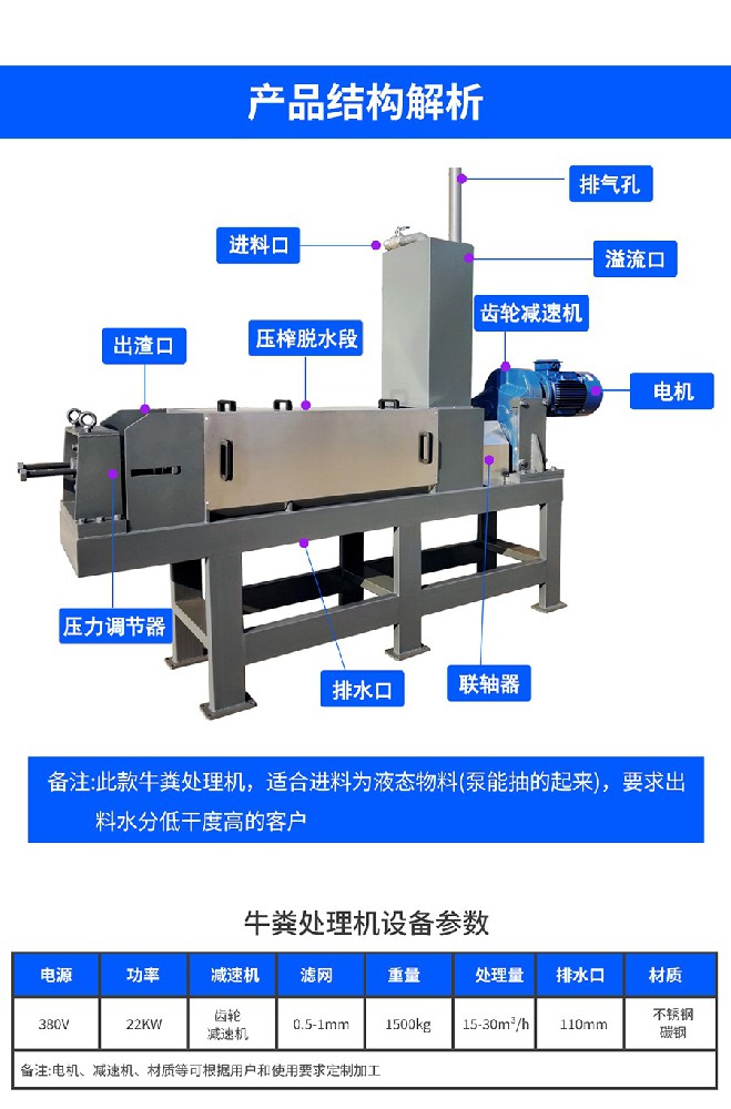 ?固體收集和液體排放?:分離出的固體部分被收集并送入儲(chǔ)存或后續(xù)處理設(shè)備,如發(fā)酵制成有機(jī)肥料;而液體部分則可能經(jīng)過進(jìn)一步處理或直接用于灌溉農(nóng)田等用途。